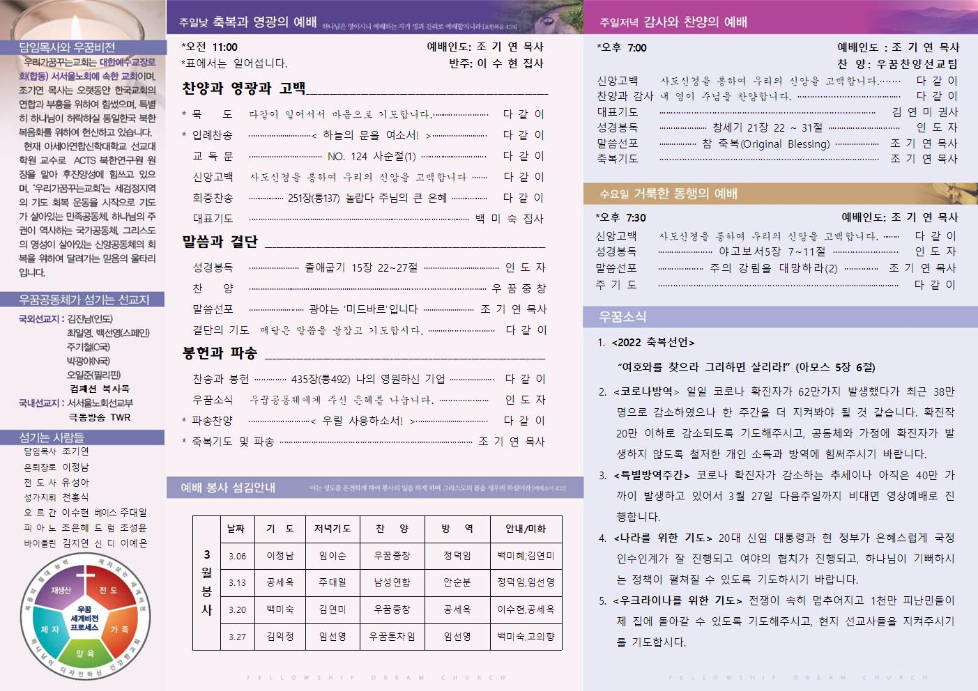 | 다음글 | 2022/03/13우꿈주보 | 운영자 | 2022.03.13 | 0 | 526 |