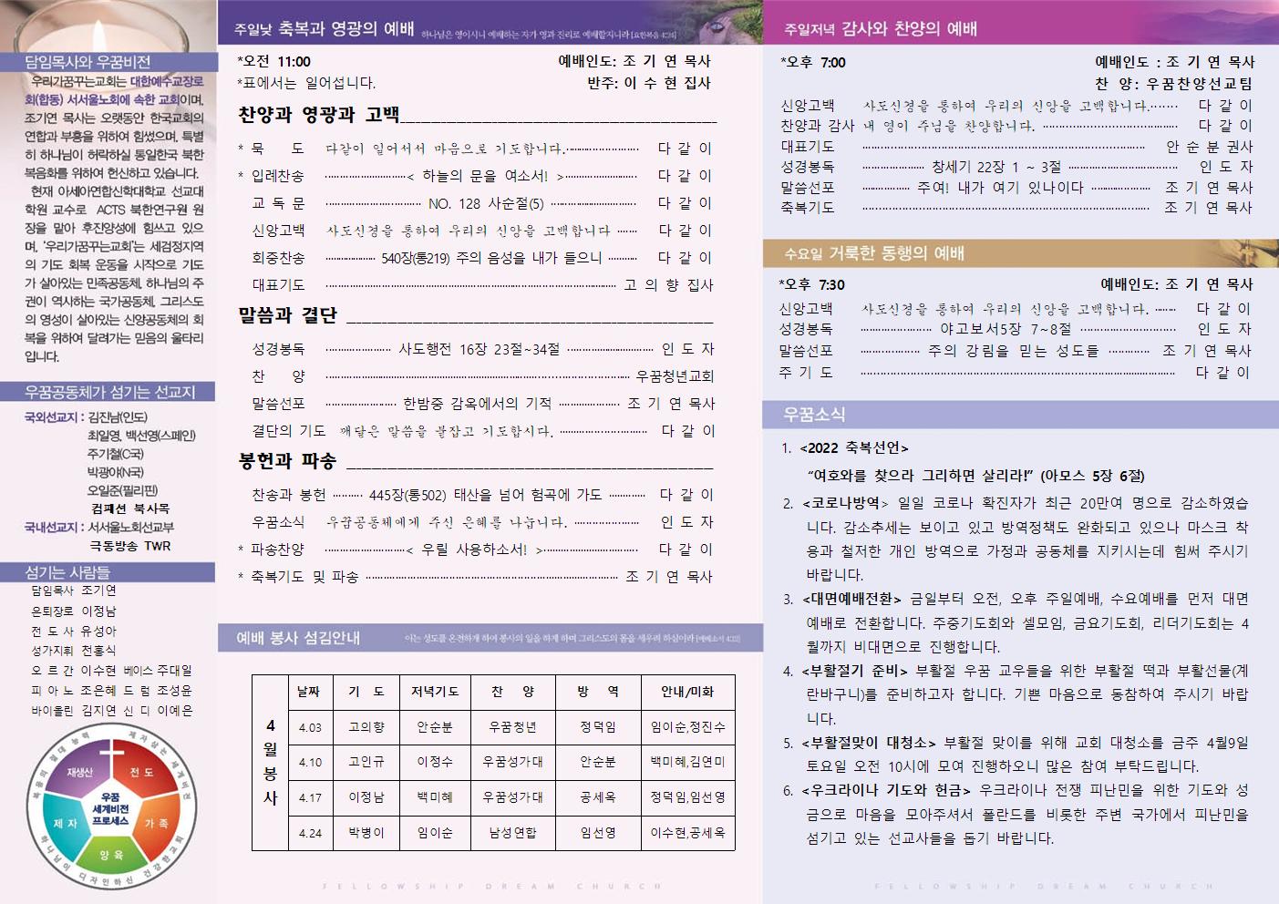 | 이전글 | 2022/04/10우꿈주보 | 운영자 | 2022.04.10 | 0 | 519 |