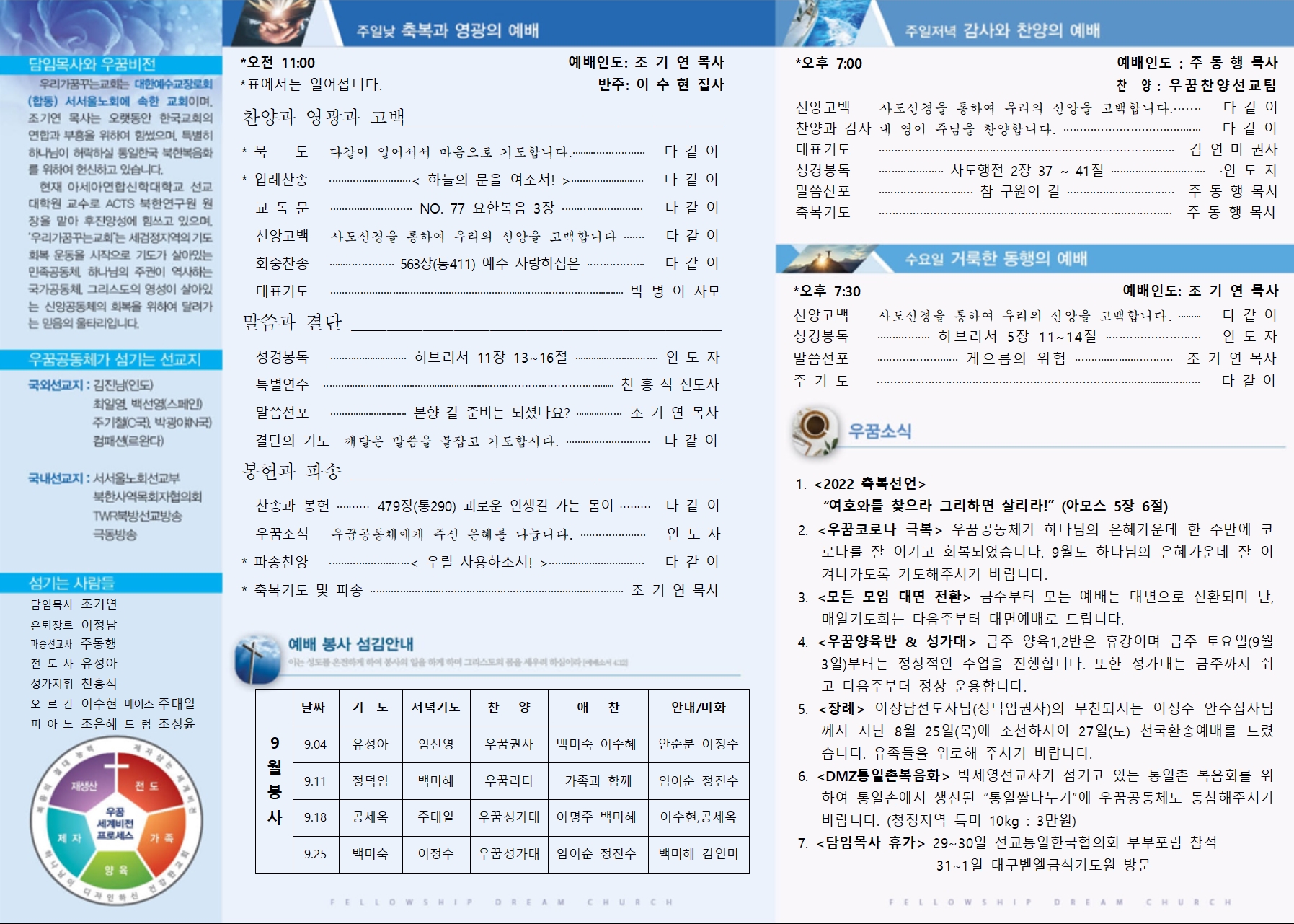 | 이전글 | 2022/09/04우꿈주보 | 운영자 | 2022.09.05 | 0 | 502 |