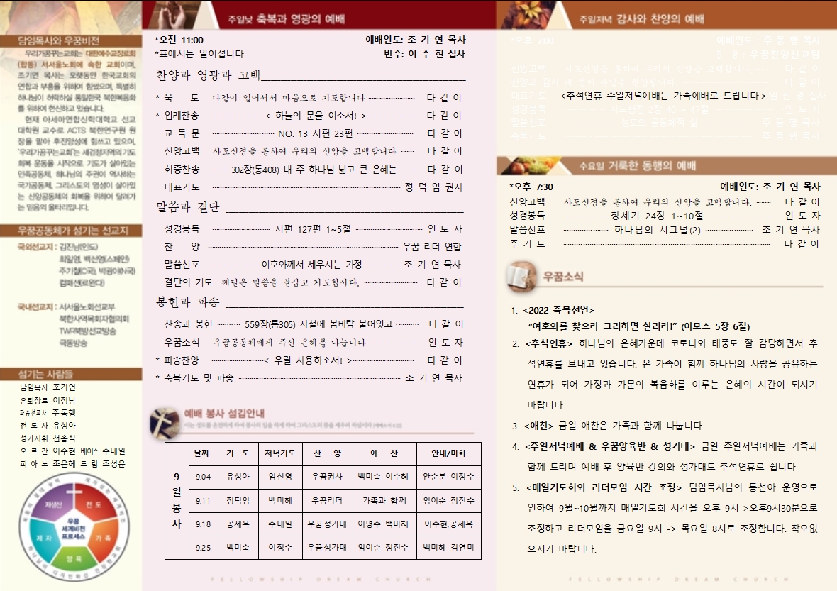 | 다음글 | 2022/09/04우꿈주보 | 운영자 | 2022.09.05 | 0 | 490 |