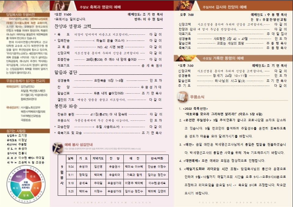 | 다음글 | 2022/09/11우꿈주보 | 운영자 | 2022.09.14 | 1 | 479 |