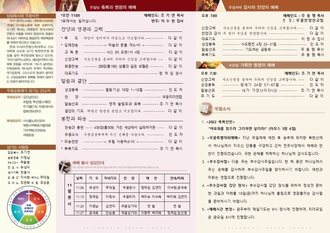 | 다음글 | 2022/11/06우꿈주보 | 운영자 | 2022.11.13 | 1 | 408 |