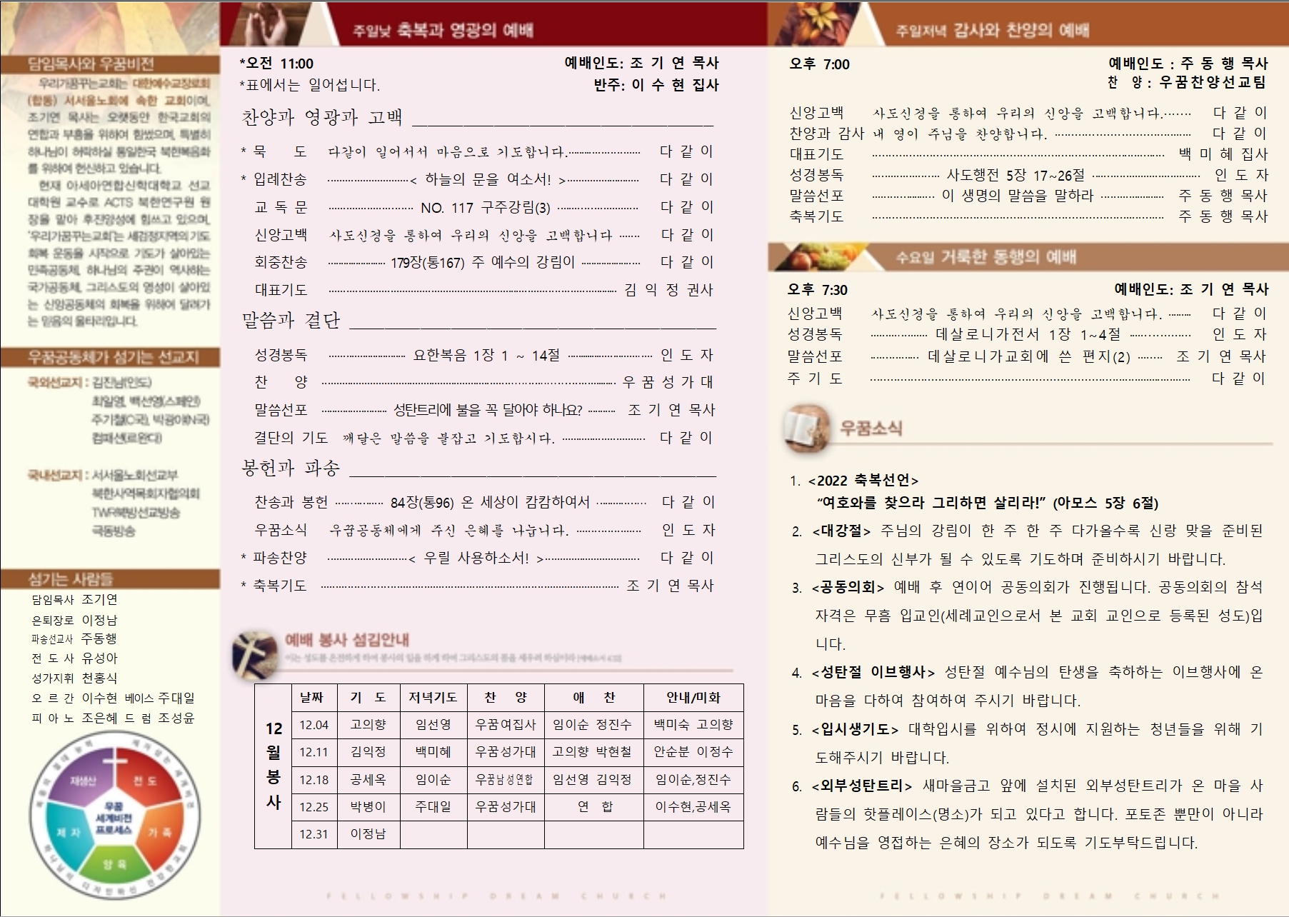 | 이전글 | 2022/12/18우꿈주보 | 운영자 | 2022.12.18 | 1 | 439 |