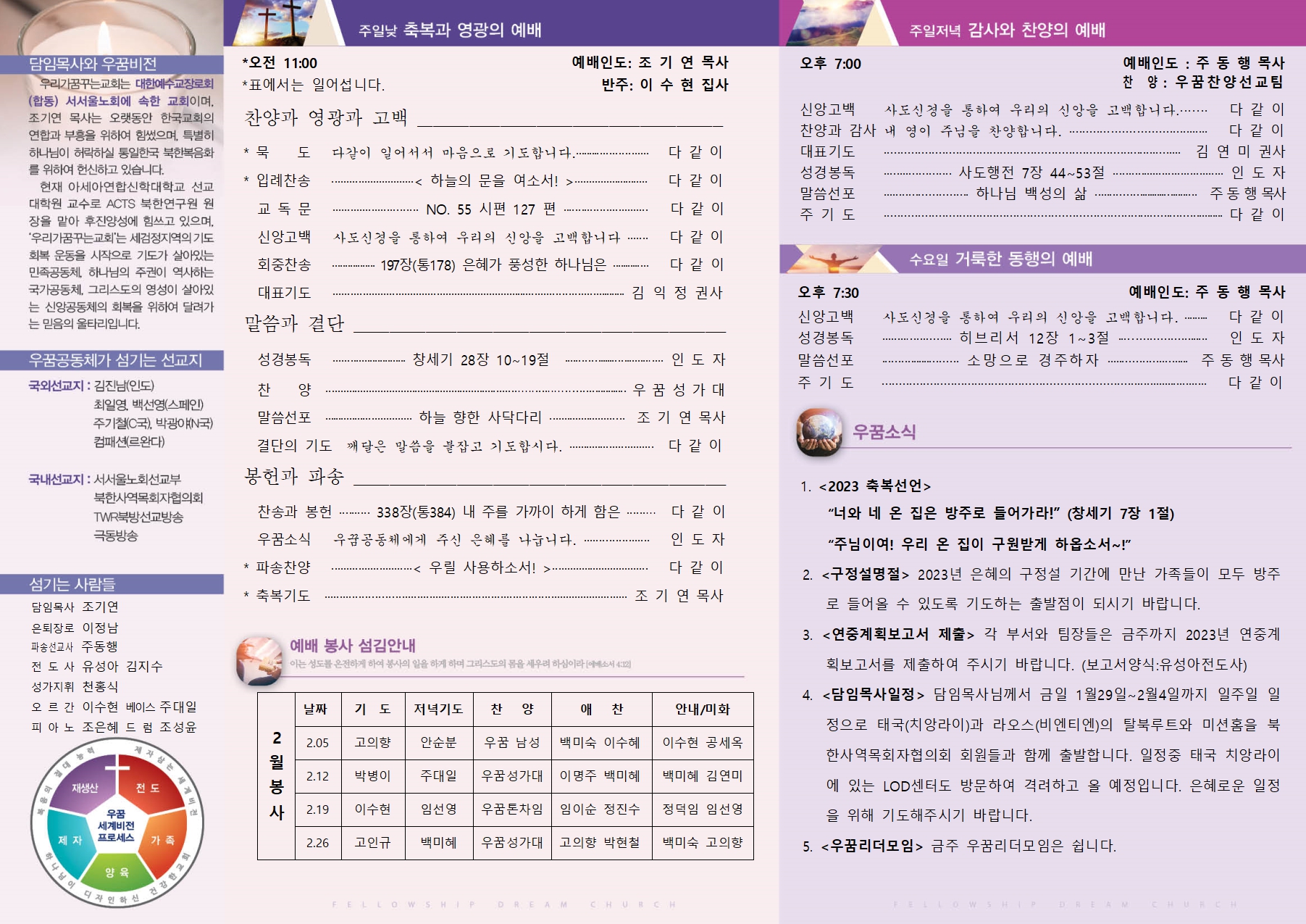 | 이전글 | 2023/02/05우꿈주보 | 운영자 | 2023.02.05 | 1 | 422 |