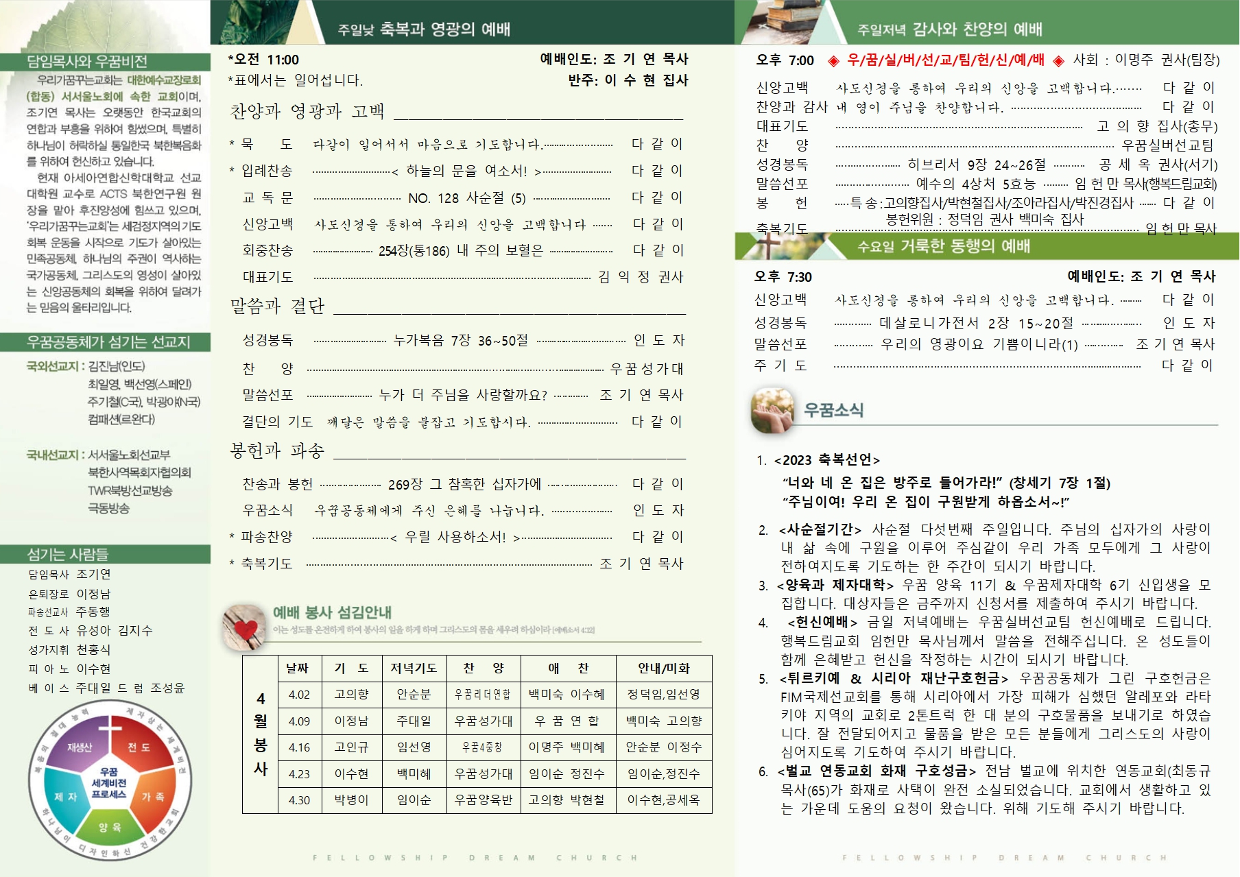 | 이전글 | 2023/04/02우꿈주보 | 운영자 | 2023.04.02 | 1 | 337 |